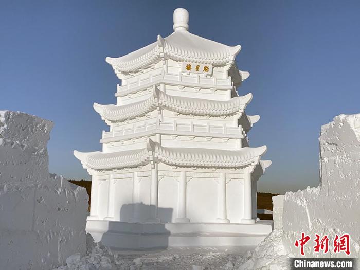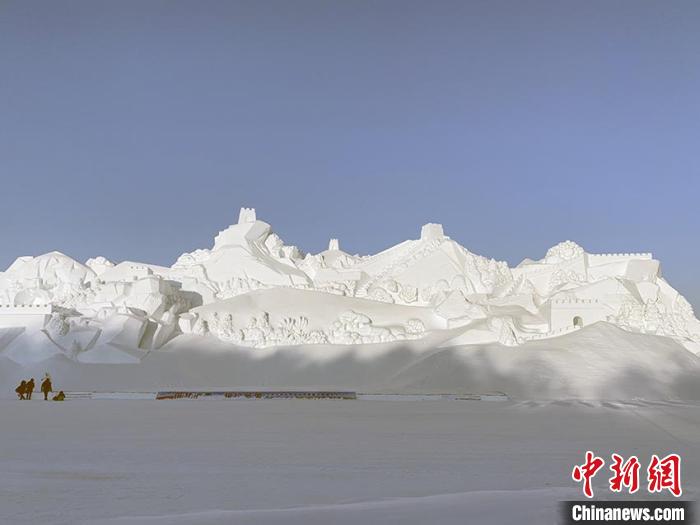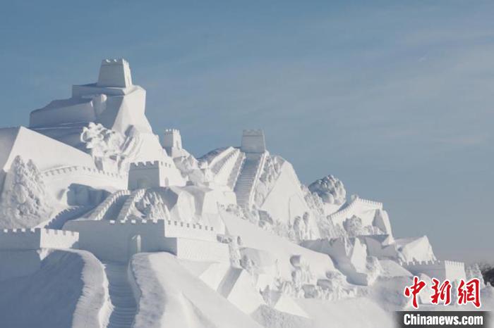 主雪雕《國泰民安》長100米、厚25米、高20米,以長城造型為主要意象,通過巍峨曲折的形式展現(xiàn)中國崛起的道路之艱險,前景之光明。