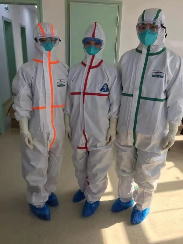 此時,身上厚重的“行頭”開始和身體對抗起來,很不舒服。工作時,走路兩腳要分開,怕把鞋套、衣服勾破了;頭不敢向上仰,時間長了會有汗珠掉下來;水蒸氣也會影響視力;口罩掛在耳朵上,時間長了會有深深的勒痕,形成疼痛感和麻木感。