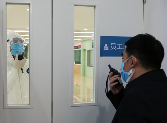 黨委書記趙永生通過對(duì)講機(jī)了解發(fā)熱門診情況