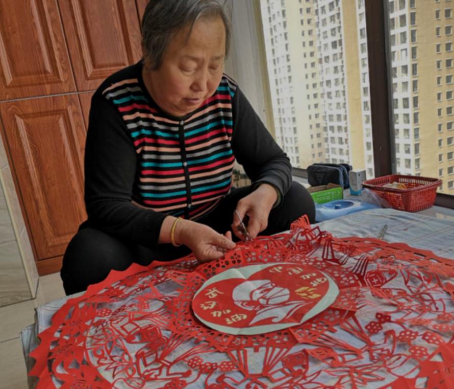 馬振山的岳母孫鳳花,是一名剪紙愛好者,年已七旬的她說:“女兒女婿是社區干部,他們每天都在防控疫情的一線工作,忙到很晚才回家。我也幫不上什么忙,在家里創作了這個剪紙希望能為抗疫勝利傳達一股精神!”她創作了剪紙作品《武漢加油》,用她特有的方式表達廣大居民抗擊疫情的決心和信心。