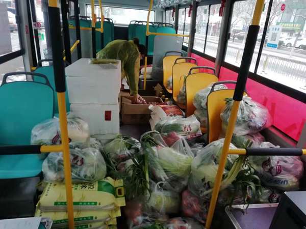 在臨汾和晉城,一輛輛掛著“抗擊疫情、愛心超市”字樣的公交車滿載方便面、雞蛋、香腸、糧油及各式各樣新鮮蔬菜等生活用品開進小區(qū),為“宅”在小區(qū)的群眾送“菜”上門。