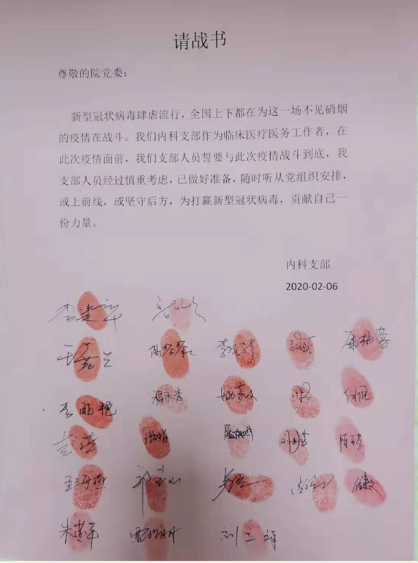 一個(gè)支部就是一座堡壘,一名黨員就是一面旗幟。在抗擊新型冠狀病毒感染的肺炎疫情關(guān)鍵時(shí)刻,太原市人民醫(yī)院內(nèi)科黨支部充分發(fā)揮黨組織戰(zhàn)斗堡壘作用和共產(chǎn)黨員先鋒模范作用,請(qǐng)戰(zhàn)書(shū)上紛紛落下了黨員們團(tuán)結(jié)的印記,沖鋒在前、主動(dòng)擔(dān)當(dāng)、勇于作為,讓鮮紅的黨旗飄揚(yáng)在疫情防控的第一線!