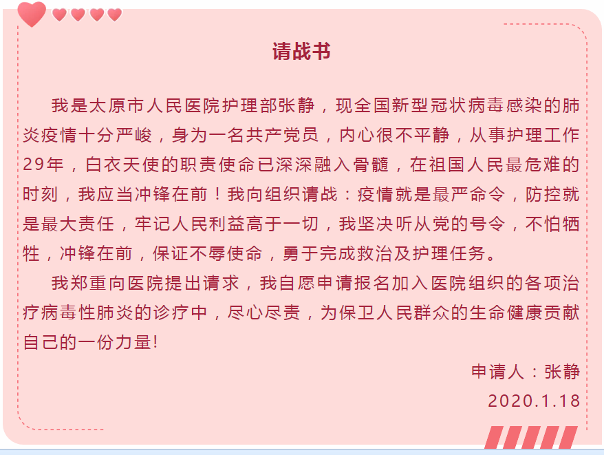 大事難事見擔當,危難時刻顯本色。在阻擊新型冠狀病毒感染的肺炎疫情特殊時期,我立志將自己的青春和熱血奉獻給黨組織,嚴格要求自己,吃苦在前,務實工作,用實際行動向黨組織靠攏,接受黨組織的考驗,和大家一起,共克時艱,共渡難關,打贏這場疫情阻擊戰,讓黨旗在防控疫情一線高高飄揚。