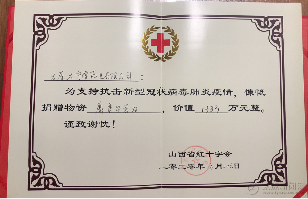 在定點捐獻醫療機構的同時,大寧堂也沒有忘記奮戰在防控一線的醫護人員和新聞工作者。1月26日,行動人員直奔機場火速慰問山西支援湖北醫療隊。近日董事長助理代表公司,專程去太原日報報業集團,對奮戰在一線的新聞工作者贈送了小安宮等預防新冠病毒藥品,并對他們的為抗擊疫情的辛勞付出表示衷心感謝。