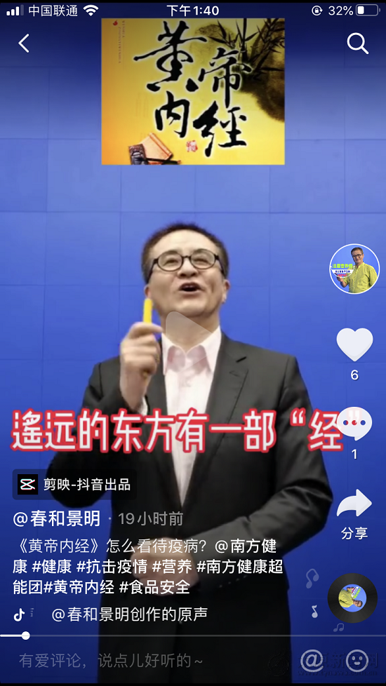 從2月9日開始發布第一個視頻,到2月14日中午12時,他已發布了17條內容。程教授以小見大、深入淺出地用生動的語言,與網友們分享了“蔬菜存放”、“抗生素服用”、“病毒是怎么發現”、“《黃帝內經》怎么看待疫病”等內容。
