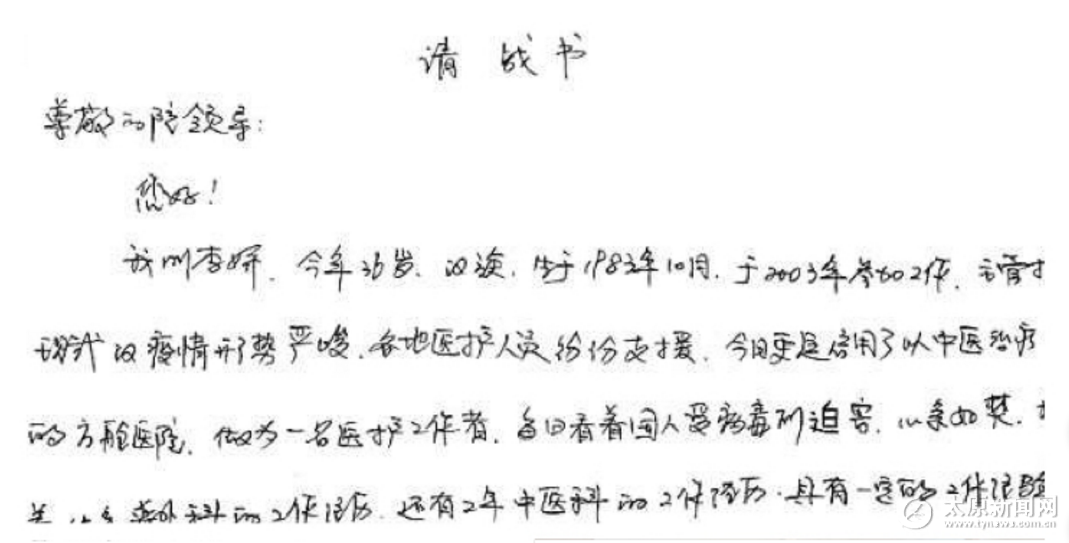 李嬌,36歲,主管護師。她是兩個孩子的媽媽。在醫院發出支援湖北的倡議后,她毫不猶豫地請戰,是同事又是愛人的陳曉飛給她鼓勁加油!“我愿全力以赴,與病毒做斗爭,我請戰!時刻準備出發,加入援鄂,逆流而上!”這是請戰,更是誓言!