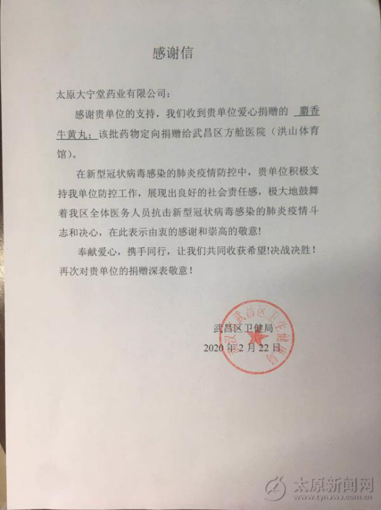 一心捐獻,不求回報的大寧堂人,當接到武昌飛來的感謝信,非常高興。捐贈行為獲得認可,非遺“小安宮”麝香牛黃丸能為武昌的戰疫情做點貢獻,大寧堂老號就心滿意足了。麝香牛黃丸、蘇合香丸、安宮牛黃丸、防風通圣丸、藿香正氣膠囊,分別列入國家和山西防控新冠肺炎推薦用藥。大寧堂人將鼓足干勁,加班加點生產,力爭將大寧堂老號擁有的“五寶”,源源不斷的提供防控一線,為了全國取得疫情阻擊戰的最后勝利,將捐獻進行到底!