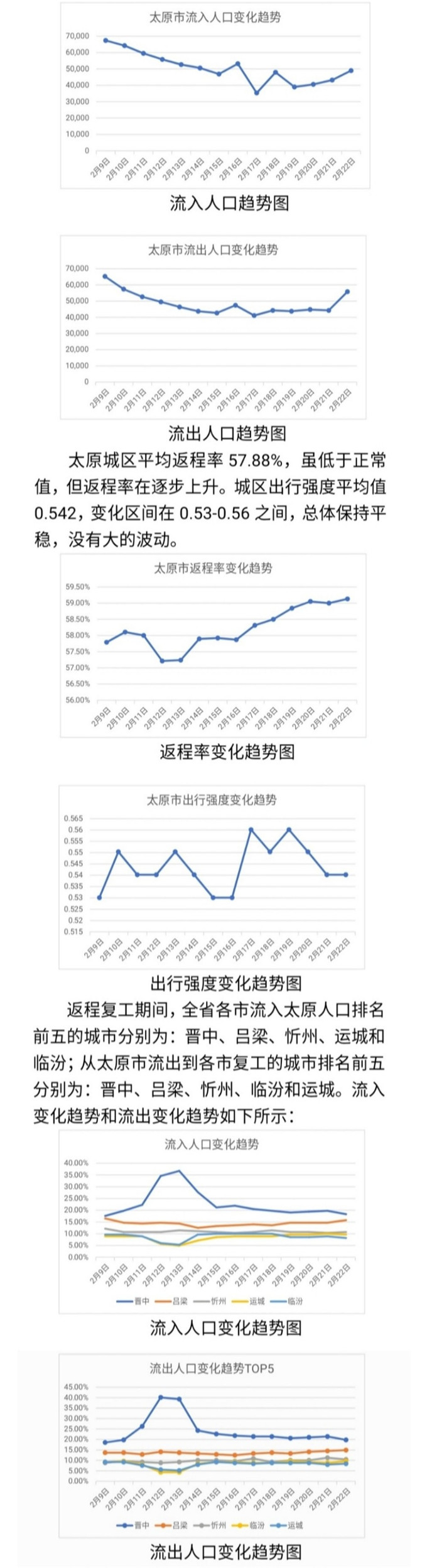 截至2月22日,返程復工期間(2月9日起)太原市累計流入人口702136人次,流出人口675426人次。