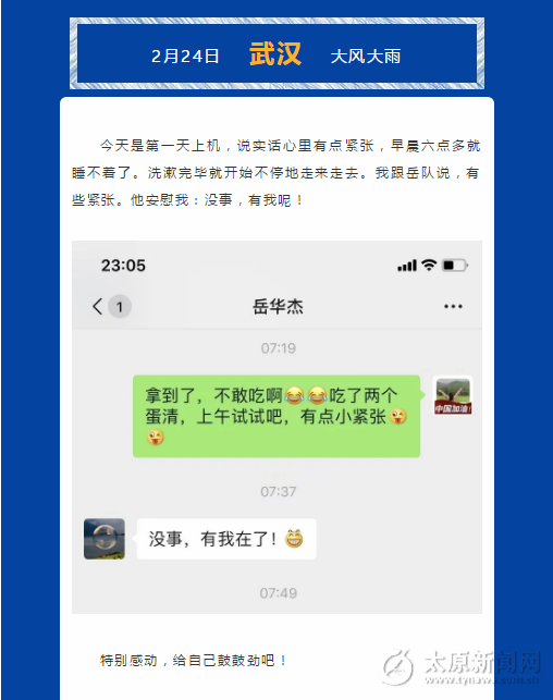 每天工作之余最開(kāi)心的就是和好朋友視頻,她們的鼓勵(lì)關(guān)愛(ài)使我勇氣倍增!我告訴他們:“在這里我并不孤單,有隊(duì)長(zhǎng)撐腰,有戰(zhàn)友們的關(guān)愛(ài),有武漢人民的信賴,覺(jué)得自己的選擇是正確的、值得的,光榮的!雖然工作很累,但是身上卻好像有使不完的勁兒。”