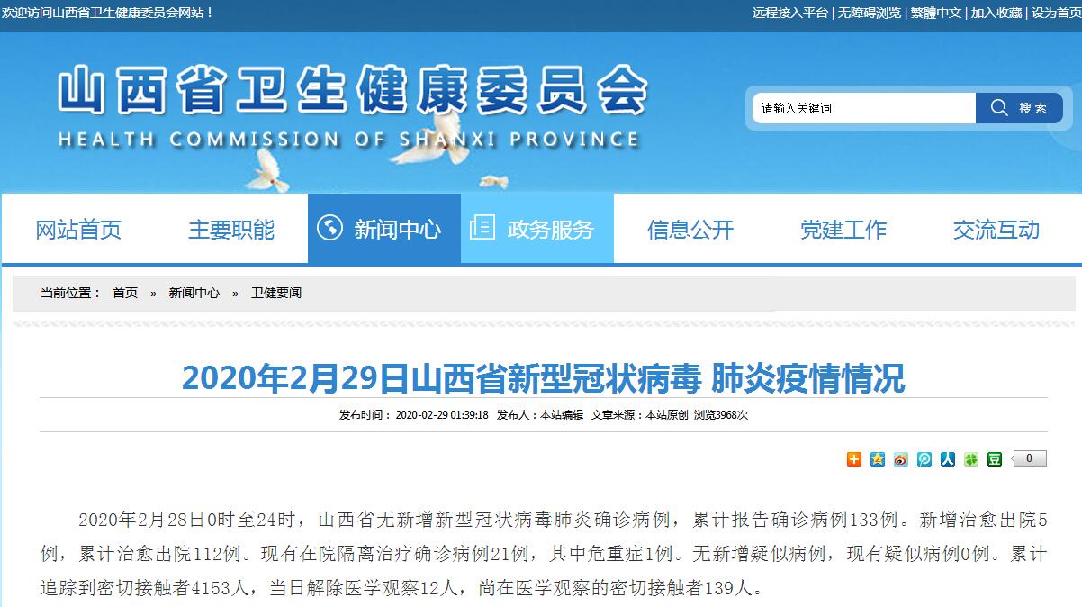 2020年2月28日0時至24時,山西省無新增新型冠狀病毒肺炎確診病例,累計報告確診病例133例。新增治愈出院5例,累計治愈出院112例?,F有在院隔離治療確診病例21例,其中危重癥1例。無新增疑似病例,現有疑似病例0例。累計追蹤到密切接觸者4153人,當日解除醫學觀察12人,尚在醫學觀察的密切接觸者139人。