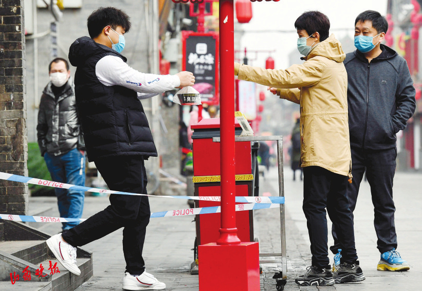 2月28日,在太原市食品街,好多餐飲小吃店陸續營業。大家為了做好疫情防控,紛紛把桌子擺在店門前、拉上警戒線,讓顧客至少保持1米以上距離取餐,還有的店鋪增加工作人員,專門給警戒線外排隊的顧客遞餐。一些大的餐飲店直接在店鋪門口辦公,只接待外賣,拒絕進店用餐,同時將門口開放的座椅也用警戒線封閉起來,防止扎堆就餐。
