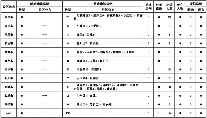 2020年2月29日0時至24時,山西省無新增新型冠狀病毒肺炎確診病例,累計報告確診病例133例。新增治愈出院2例,累計治愈出院114例。現(xiàn)有在院隔離治療確診病例19例,其中危重癥1例。無新增疑似病例,現(xiàn)有疑似病例0例。累計追蹤到密切接觸者4154人,當日解除醫(yī)學觀察10人,尚在醫(yī)學觀察的密切接觸者130人。
