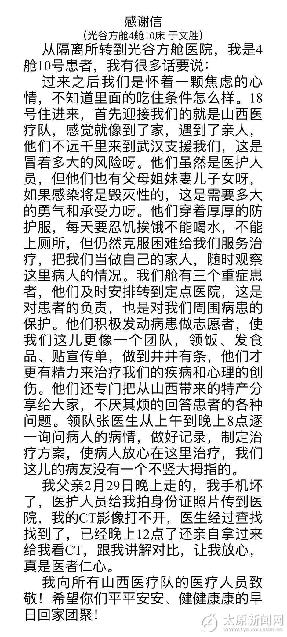 “張開慈祥的雙翅,飛向溫暖的他鄉,陪人間一起面對,陪痛苦一起度過。”3月2日,援鄂山西醫療隊員李雁梅收到了一封感謝信,來自于光谷方艙醫院4艙10號患者。他在信中感謝道:山西醫療隊員們每日穿著厚厚的防護服,忍饑挨餓不能喝水,不能上廁所,但仍然克服困難給我們服務治療,把我們當做自己的家人,醫者仁心啊!