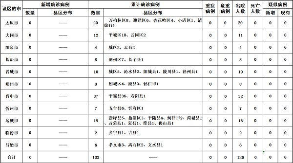 2020年3月6日0時至24時,山西省無新增新型冠狀病毒肺炎確診病例,累計報告確診病例133例。無新增治愈出院病例,累計治愈出院126例。現有在院隔離治療確診病例7例。無新增疑似病例,現有疑似病例0例。累計追蹤到密切接觸者4177人,當日解除醫學觀察2人,尚在醫學觀察的密切接觸者67人。