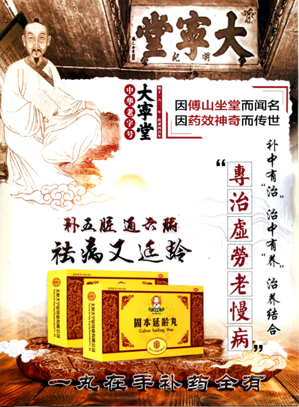 1383年,明皇宮太醫(yī)陳乾忠與馬太醫(yī)之子馬禹臣將此方帶出了皇宮,成為了大寧堂藥鋪鎮(zhèn)堂之寶。傅山在原方基礎(chǔ)上做出了增減調(diào)劑處方,使之做到了心、肝、脾、肺、腎五臟,胃、膽、大腸、小腸、膀胱、上中下三焦六腑兼顧,補(bǔ)五臟之虛,通六腑之淤,補(bǔ)中有治,治中有養(yǎng),治養(yǎng)結(jié)合,專(zhuān)治虛勞老慢病,治病又延齡,成為延年益壽“仙丹”,取名“固本延齡丹”。1639年傅山秘授此方于大寧堂,曾為大寧堂鎮(zhèn)堂之寶。固本延齡丸從“還少丹”問(wèn)世至今1399年,處方幾經(jīng)衍生調(diào)劑,氣血陰陽(yáng)“補(bǔ)、治、養(yǎng)”,功全效助,藥效神妙,代代相傳,“救命安宮牛黃,長(zhǎng)壽固本延齡”是歷史對(duì)它的評(píng)價(jià)。