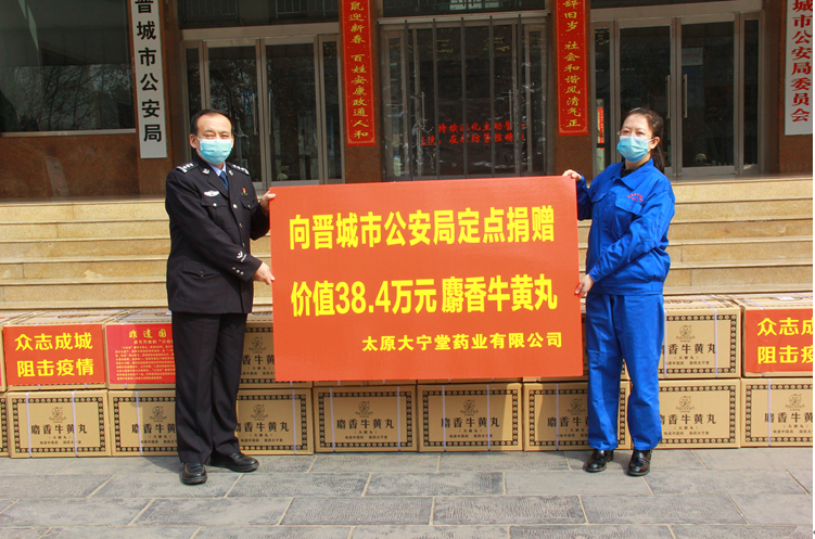 萬眾一心,共同抗疫。3月6日早晨,一輛裝載麝香牛黃丸的依維柯,在公司范永強副總裁等驅車陪伴下,由太原大寧堂藥業有限公司駛出,一路奔馳前往晉城市。這批共計6400盒、價值38.4萬元的鎮堂之寶,非遺國粹“小安宮”麝香牛黃丸,同晉城市紅十字會攜手,定向捐贈給晉城市公安局,慰問一線干警。晉城市副市長、公安局長王斌權、晉城市公安局副局長史慧軍、晉城市公安局政治部主任李平、晉城市紅十字會賑濟救護科科長張海軍及太原大寧堂藥業有限公司副總裁范永強、董事長總裁助理馬婕、營銷負責人副總監杜旺等相關領導出席了捐贈儀式。