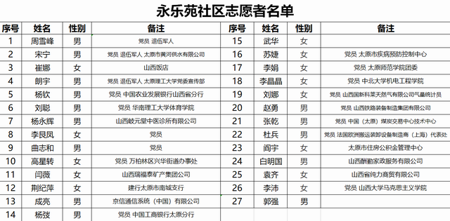 與此同時,周雪峰與太原黃河供水有限公司員工宋寧兩位退伍軍人萌生了組織志愿者團隊的想法,在永樂苑社區及社區居民支持下,組織起了27人的志愿者團隊。