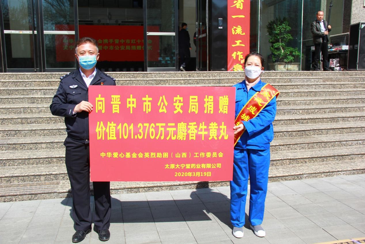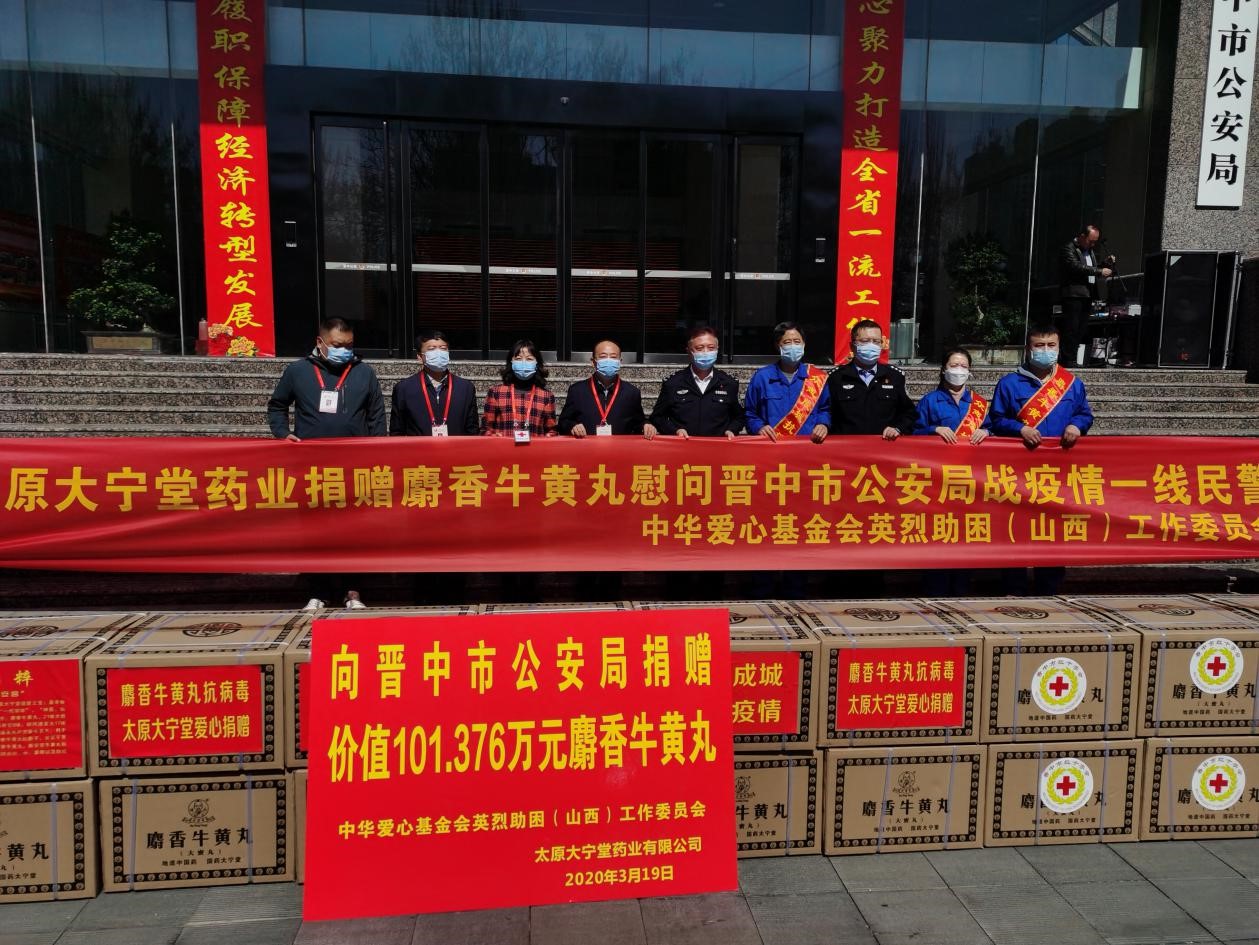 3月19日上午,大寧堂“戰疫情捐獻活動”行動小組一行6人,隨行貨車依維柯裝載著共計16896盒、價值101.376萬元的鎮堂之寶、非遺國粹----“小安宮”麝香牛黃丸由廠區駛出直奔晉中。行動小組與中華愛心基金會英烈助困(山西)工作委員會攜手攜手,慰問一線公安民警,將這批防疫藥品,捐獻給市公安局。