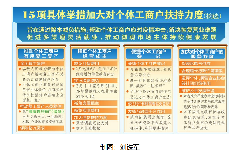 為推動個體工商戶全面復工復產,《若干措施》明確,各級政府一律不得為其復工復產設定前提條件,不得為個體工商戶正常經營附加條件。人員可以憑“健康通行碼”(綠碼)自由出入各類交通卡口、公共場所、小區、企業和乘坐交通工具,無需另行開具相關證明材料,為群眾正常出行和復工復產人員有序流動提供重要保障。