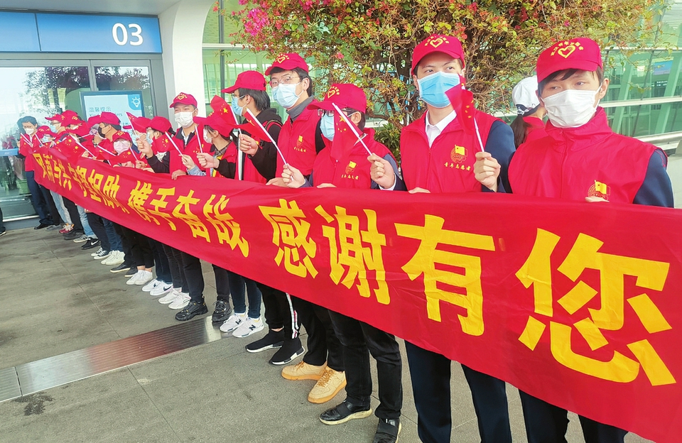 圖為武漢天河機場出發口,武漢志愿者們打起條幅夾道歡送隊員