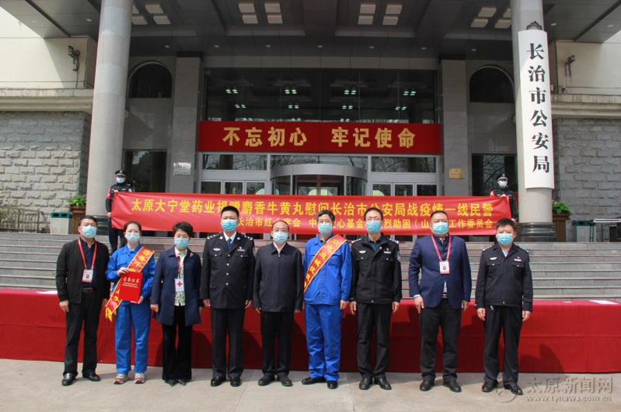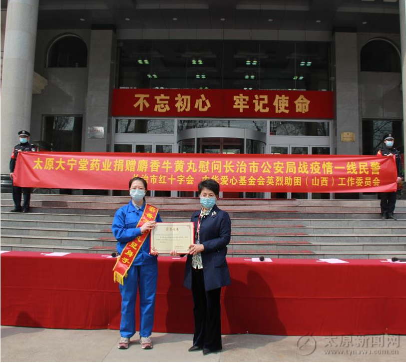 捐獻儀式上,成文碧同志代表市局黨委和全市公安民警輔警,向中華愛心基金會英烈助困(山西)工委會、市紅十字會及太原大寧堂藥業有限公司表示衷心感謝。他指出,太原大寧堂藥業有限公司是一個百年中華老字號中藥制藥企業,此次向我市公安機關捐贈的非遺國粹“小安宮”麝香牛黃丸,是國家中藥獨家保護品種,祛火除毒有顯著療效,用于中度、重度新冠患者治療使用。此次捐獻,必將有效提升公安機關一線抗疫工作的防護能力,體現出一個民營企業家和中華老字號企業胸懷大局的社會責任。全市各級公安機關將不負社會各界的關愛和支持,不負黨和人民的信任和重托,一如既往,再接再厲,堅決筑牢疫情防控的安全屏障,堅定不移維護全市政治安全和社會穩定,為企業發展創造良好的營商環境,為堅決打贏疫情防控人民戰爭、總體戰、阻擊戰做出新的更大的貢獻。