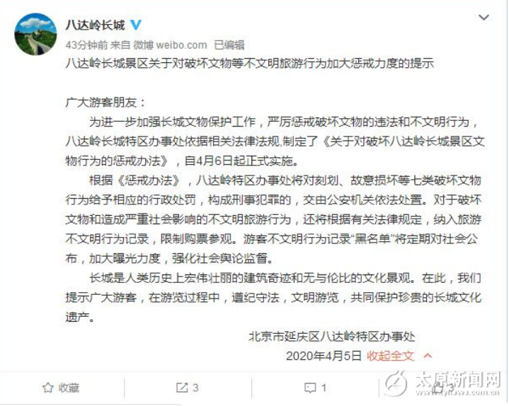 《提示》指出,為進一步加強長城文物保護工作,嚴厲懲戒破壞文物的違法和不文明行為,八達嶺長城特區辦事處依據相關法律法規,制定了《關于對破壞八達嶺長城景區文物行為的懲戒辦法》,自4月6日起正式實施。