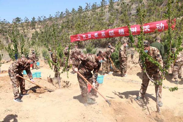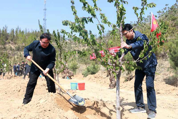 在義務(wù)植樹活動現(xiàn)場,一個(gè)個(gè)“蒙面”戰(zhàn)士干勁十足,齊心協(xié)力扶直樹苗,揮動鐵鍬、鋤頭細(xì)心填土,一絲不茍將土踩實(shí)、澆水,各個(gè)環(huán)節(jié)有條不紊,現(xiàn)場處處都是忙碌的身影。經(jīng)過大家的緊張勞動,200株油松、400株櫻桃錯(cuò)落分布、迎風(fēng)挺立,呈現(xiàn)出勃勃生機(jī)。