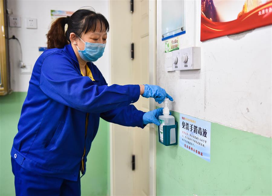 太原市杏花嶺區(qū)第一中學(xué),工作人員在教室內(nèi)放置免洗手消毒液。