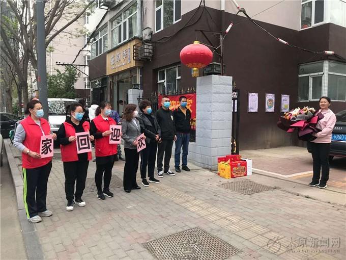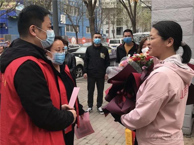 王瑾來自山西醫(yī)科大學第二醫(yī)院心內科,二月初隨山西省第二批醫(yī)療救援隊奔赴湖北抗擊疫情最前線,她負責前往支援武漢華中科技大學同濟醫(yī)院中法新城院區(qū)。目前已結束為期14天的集中休整,回到家中與親人團聚。在得知支援湖北抗疫英雄平安回家的消息后,宋毅嶸帶領社區(qū)全體工作人員向王瑾送去充滿敬意的鮮花與慰問品。