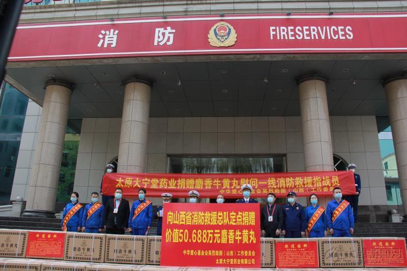 疫情發生以來,全體消防指戰員非常辛苦,哪里有急難險重的任務哪里就有消防員的身影。無論在抗擊疫情的戰場,還是在滅火重地,他們保衛著人民生命及財產的安全。更讓人感動的是,有的消防戰士在重大火災現場獻出了年輕而寶貴的生命。疫情期間山西五臺山、榆社等地區突發火情,消防指戰員的付出,大寧堂人看在眼里,疼在心上。為此,中華老號大寧堂決定向山西省消防救援總隊捐獻8448盒價值50.688萬元,鎮堂之寶非遺國粹——“小安宮”麝香牛黃丸,為全省消防救援官兵的健康保駕護航。