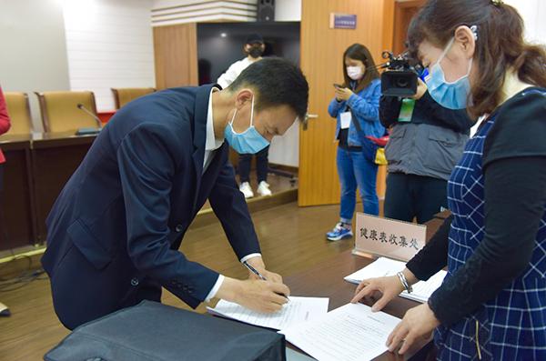 代表們領到會議資料、口罩和消毒液