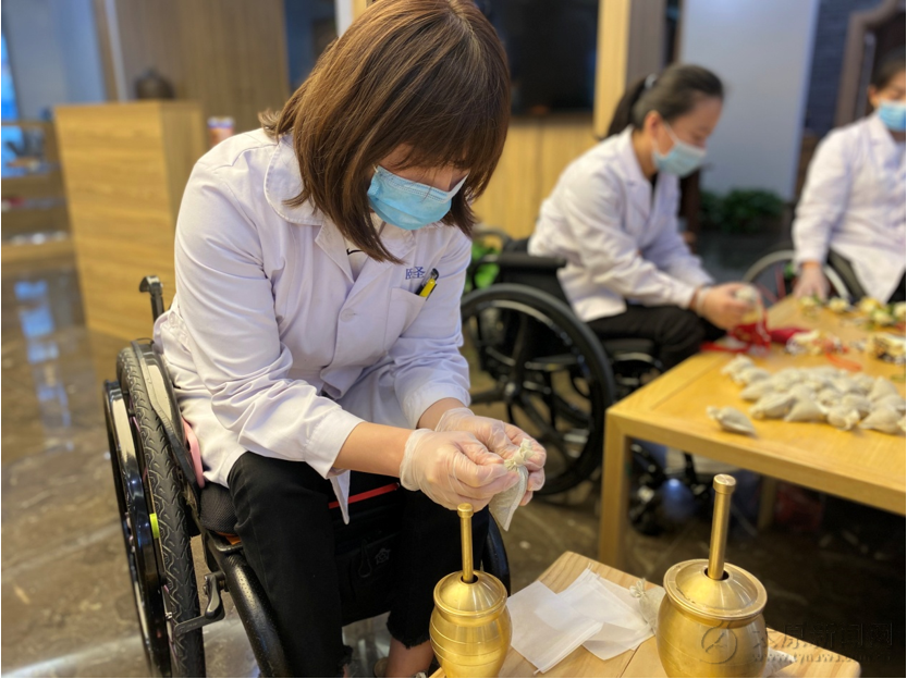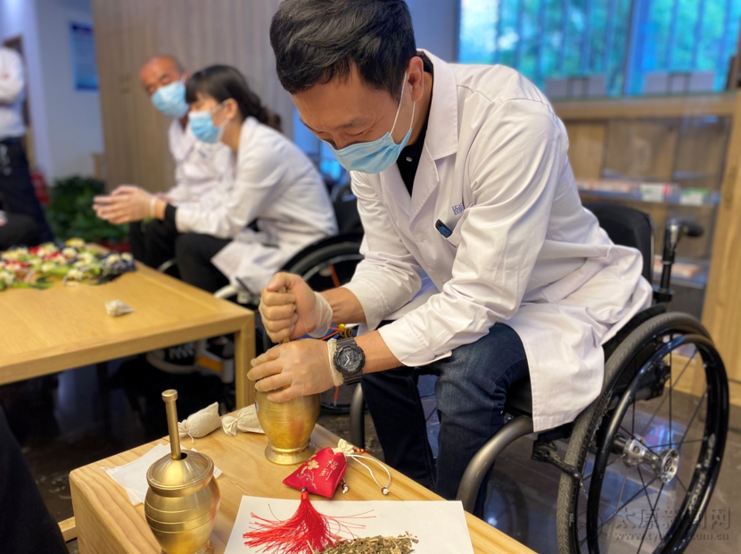 為使活動(dòng)順利進(jìn)行,10余名來自山西各地的殘疾人朋友提前2天前往頤圣堂中醫(yī)館,接受專業(yè)培訓(xùn)。從稱量藥材、研磨粉末、扎繩包裝,到最后制作成香囊成品,殘疾人朋友專注而認(rèn)真,在專業(yè)人員耐心講解和大家的共同參與下,耗時(shí)2天,精心準(zhǔn)備了300余個(gè)香囊。