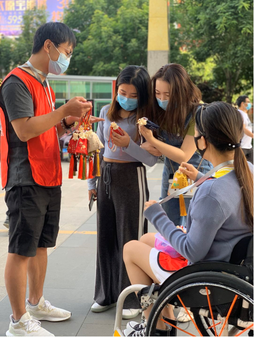 5月17日下午,殘疾人朋友們帶著精心制作的300余個(gè)香囊,開始義賣活動(dòng)。他們熱情地吆喝,耐心地講解,吸引了不少顧客駐足詢問、購買。很快,香囊被搶購一空。顧客的滿意,讓殘疾人朋友倍感欣慰,成就感十足。