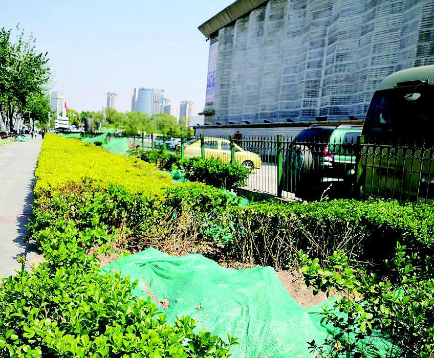拍攝經過:5月8日,我途經迎澤西大街煤炭博物館北門時,看到門口綠化帶內少了一塊綠植,裸露的黃土上遮蓋著綠網。郁郁蔥蔥的綠植中,突然少了一塊,有礙觀瞻。希望相關部門盡快補栽綠植。