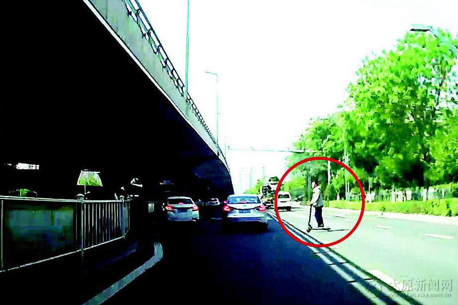 拍攝經(jīng)過:5月5日下午3時許,我駕車由南向北途經(jīng)東中環(huán)路府東街口時,突然看到路東非機動車道與機動車道之間的綠化帶內(nèi)沖出一名男子。這名男子踩著踏板電動車快速從機動車道橫穿而過,著實嚇了我一跳。令人氣憤的是,男子橫穿馬路的地點距離前方人行橫道只有十幾米遠,如此任意橫穿馬路,一旦發(fā)生事故真是害人害己。