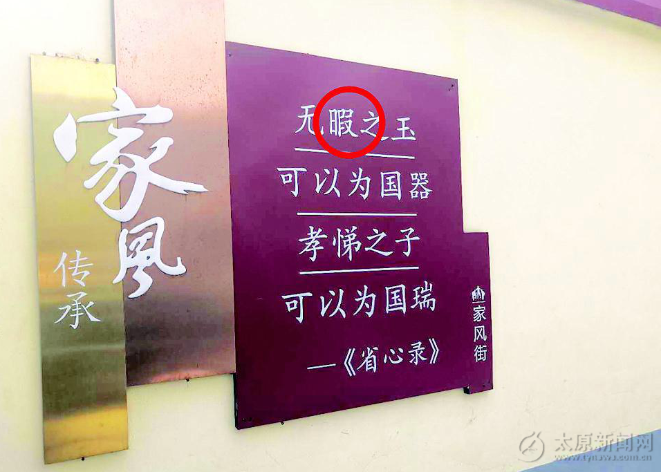 拍攝經過:桃園二巷杏林一條2號院東墻上的一個宣傳版面存在別字。上面將“無瑕之玉”寫成了“無暇之玉”。無瑕指玉上沒有瑕疵,比如人和事物沒有缺點或污點,形容非常完美;無暇指沒有空閑的時間。“無暇之玉”講不通,在此,希望相關部門盡快處置。