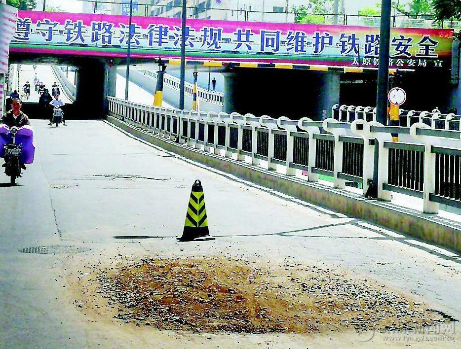 這是記者5月25日在迎春街鐵道橋下西向非機(jī)動車道上拍到的圖片。此處平整的路面上出現(xiàn)大塊破損,砂石翻起,有安全隱患,很容易使騎車人摔倒。為減小安全隱患,有人特意在此擺設(shè)了一個警示錐。希望相關(guān)部門盡快修繕,以消除隱患,確保騎車人安全。