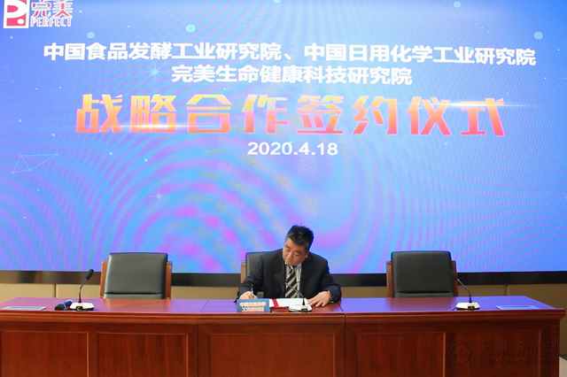 4月18日,完美生命健康科技研究院與中國食品發酵工業研究院、中國日用化學工業研究院、暨南大學舉行戰略合作云簽約。完美(中國)有限公司董事長古潤金,中國保健協會副理事長兼秘書長、完美生命健康科技研究院名譽院長徐華鋒,中國輕工集團有限公司副總經理、食品院董事長、日化院董事長蔡木易,暨南大學副校長洪岸等分別在中山、北京、廣州三地參加云端簽約儀式。