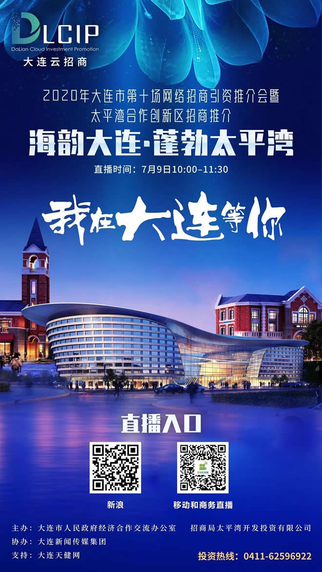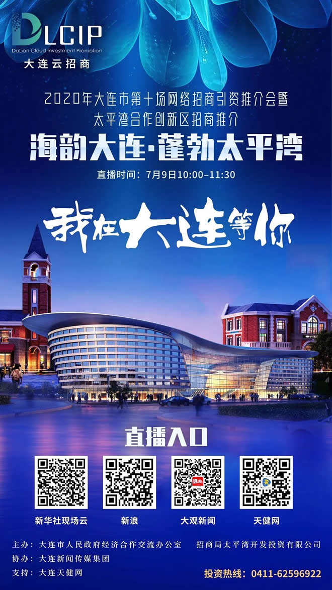 7月9日上午10:00-11:30,由大連市人民政府經濟合作交流辦公室、招商局太平灣開發投資有限公司主辦,大連新聞傳媒集團協辦的2020年大連市第十場網絡招商引資推介會暨太平灣合作創新區招商推介會“海韻大連?蓬勃太平灣”將震撼登場。