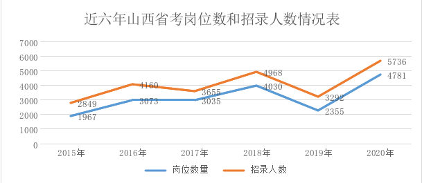 從表中可以看出,近六年來山西省公務員考試崗位數量和招考人數,從15年開始每兩年的趨勢是先升后降的規律,在16年、18年、20年相較于上一年來說人數都會明顯上升。2020年是招錄崗位和招錄人數最多的一年,共招錄5736人。2015年則是招錄崗位和招考人數最少的一年。2020年上半年由于疫情的影響,在就業方面受到了一定的影響,政府通過招錄人才的方式來緩解就業壓力,因此2020年省考對于各位考生來說是非常不錯的機會,一定要把握住。