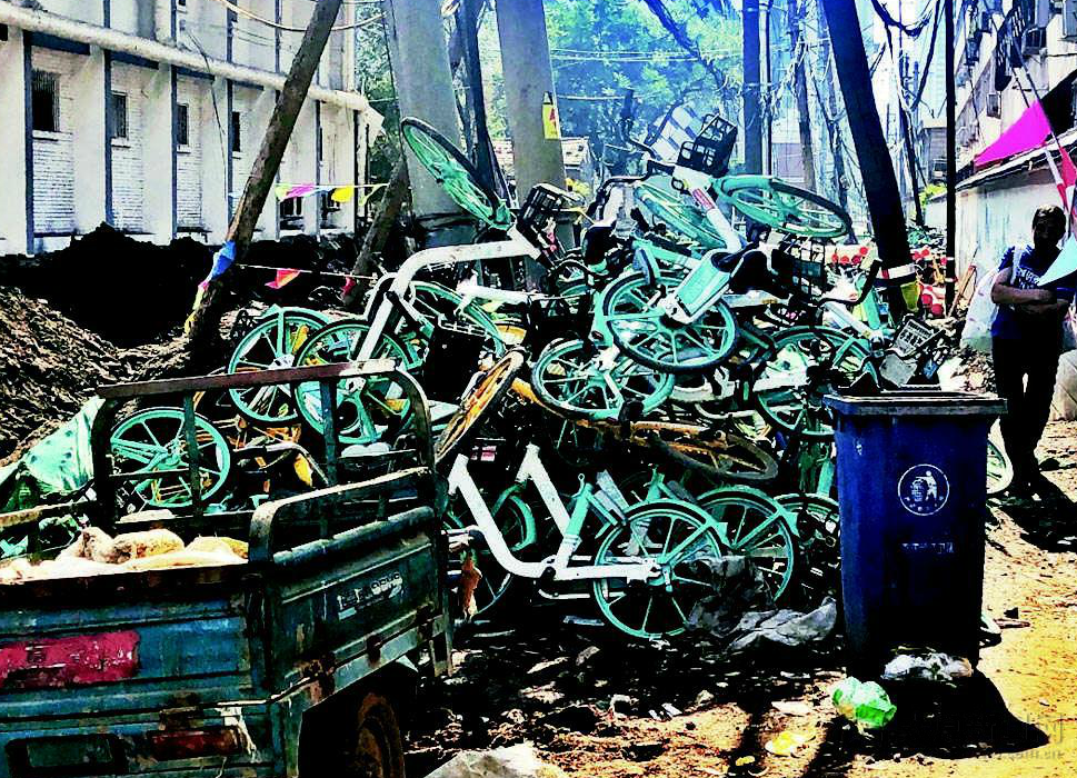 7月15日,杏花嶺區東二道巷改造進行中,共享單車如同垃圾一樣被堆放在工地現場,如此不文明行為存在著安全隱患。