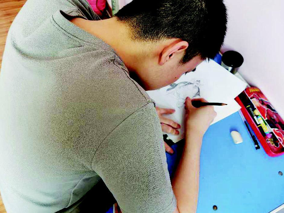 社區(qū)服務(wù)中心懂繪畫的老師重點(diǎn)發(fā)展他的繪畫天賦,教授課程,從開始最簡單的卡通簡筆畫,到現(xiàn)在能夠完成一幅復(fù)雜的線條人物畫,趙文博進(jìn)步非常大。老師們說,畫畫改變了趙文博,一旦拿起畫筆,平常坐不住的趙文博就像變了一個人。在老師的引導(dǎo)鼓勵下,趙文博的繪畫水平有了很大的進(jìn)步,性情也有了很大改變,在2019年靈星年會上他竟然配合老師完成了節(jié)目主持。現(xiàn)在的趙文博,目標(biāo)是有一天能夠辦自己的個人畫展。