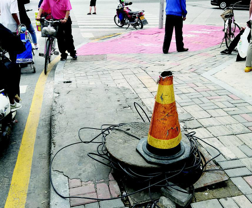 7月18日,在敦化南路迎春街口西北角便道上,一處通信井內的線纜太多塞不下,不少線纜凸出井外。為了提醒路人注意,產權單位在線纜上蓋上井蓋,還在井蓋上放置了警示錐。雖然這種做法起到了提醒路人的作用,但并沒有解決問題。此處便道本來就狹窄,再加上通信井的影響,給路人通行造成不便,希望產權單位盡快處理,方便路人通行。