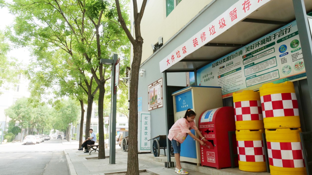 “小區之前有40個垃圾點位,在推行垃圾分類之后縮減為7個點位,實行定時定點投放,每天7:00-9:00和17:30-20:30兩個時段內,會有垃圾分類督導員幫助住戶正確進行垃圾分類。”