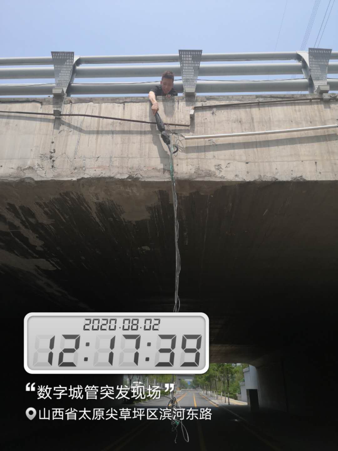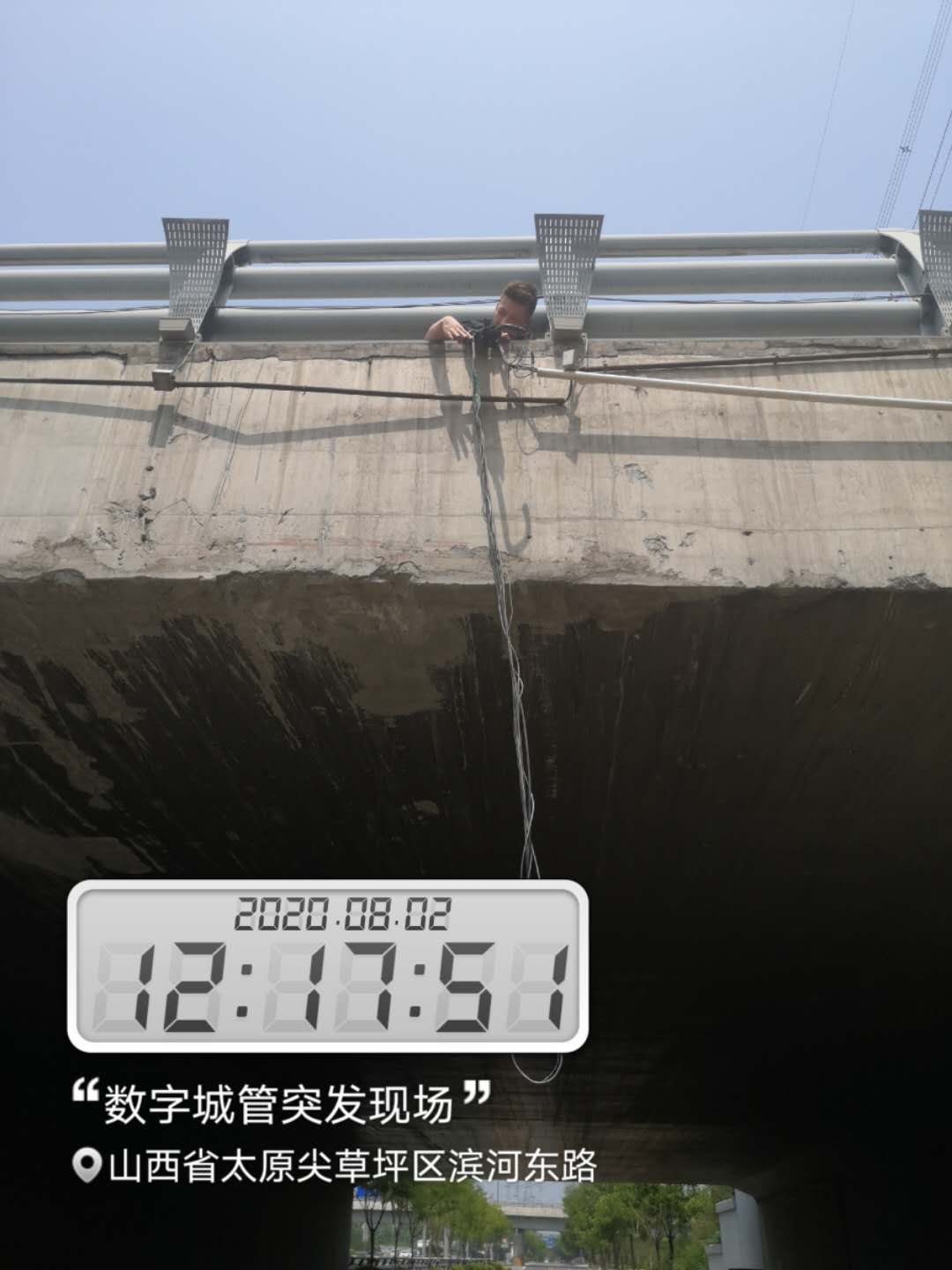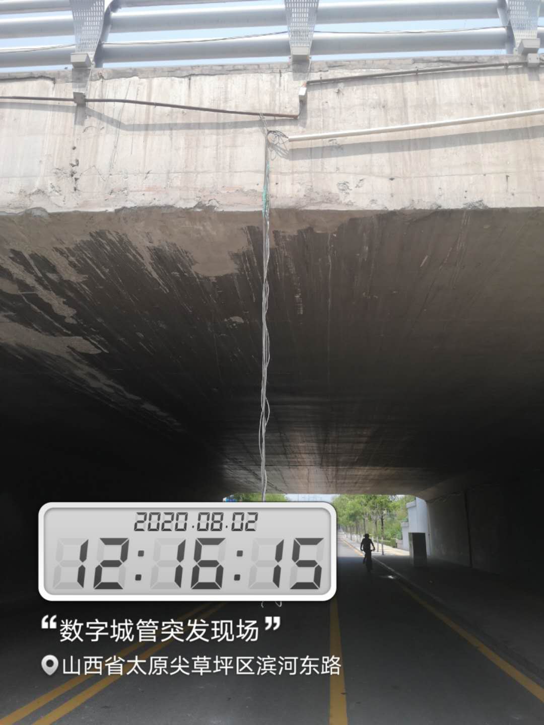 當日中午,太原數字城管環達信息采集公司采集員李云翠,巡查至尖草坪區濱河東路柴村橋下穿通道,發現搭在橋梁上的一根跨街線纜,斷裂后垂落在行車道上方。由于垂落線纜位于橋下通道背光陰暗處,騎行市民從遠處不易提前發現,懸在半空離地僅有1米多高,一路下坡慣性車速快,行至此處突然緊急剎車躲閃,一旦疏忽便會掛碰傷及臉部,容易引發車倒人傷次生災害。