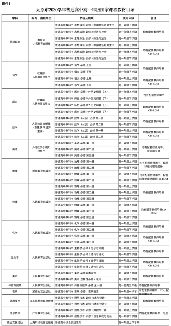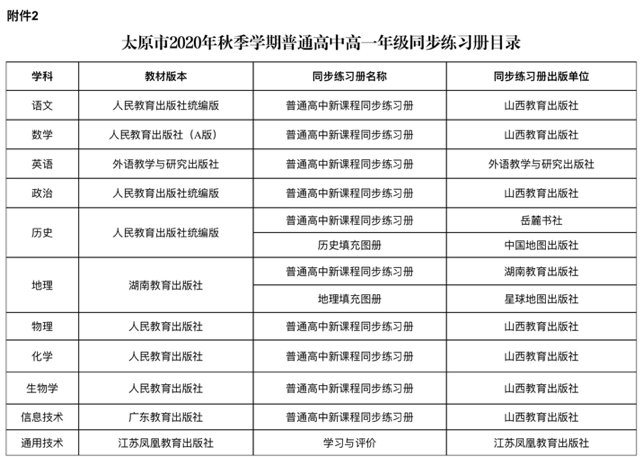 根據教育部有關部署及《山西省教育廳關于印發<山西省2020年中小學教學用書目錄>的通知》(晉教基〔2020〕8號)和《山西省教育廳關于公布<山西省2020年秋季學期普通高中高一年級同步練習冊目錄>的通知》(晉教基〔2020〕16號),太原市教育局公布了《太原市2020年秋季學期普通高中高一年級教材及同步練習冊目錄》的通知。