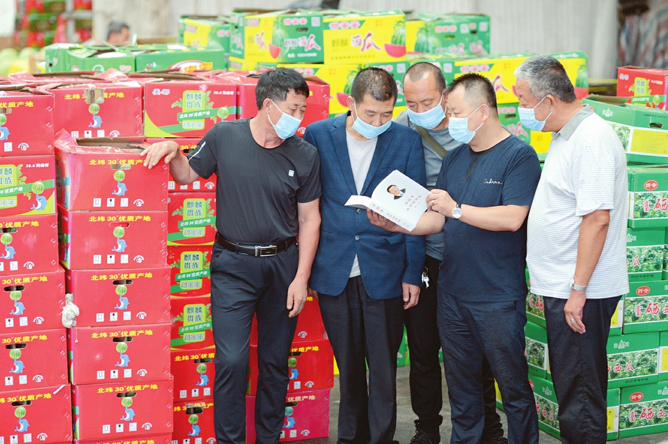 8月5日,太原市河西農產品有限公司黨支部的黨員志愿者正為太原市河西農副產品市場內的黨員經營者宣讀介紹《習近平談治國理政》第三卷。李兆民攝