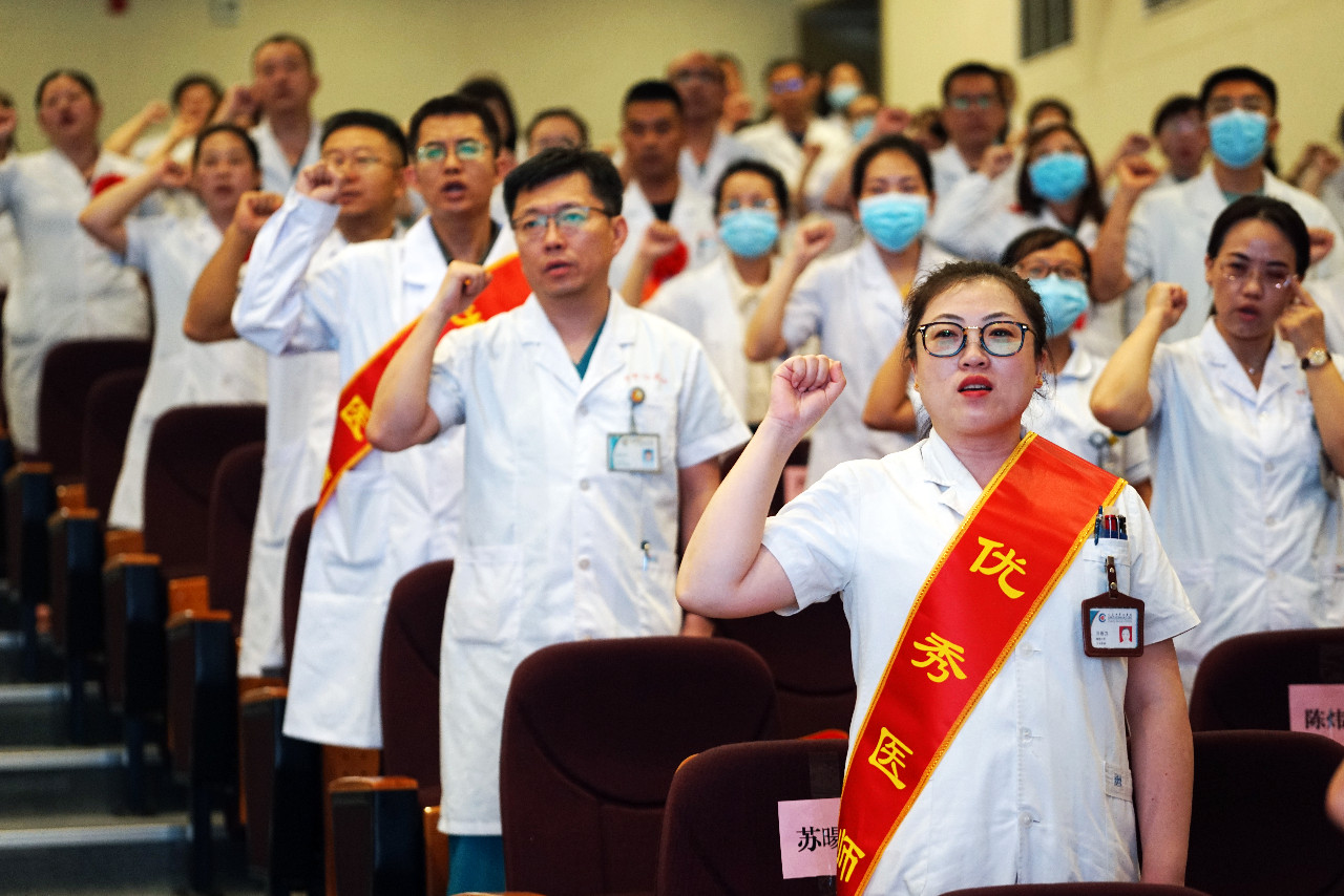 在這個特殊的日子里,參會的醫師們一起重溫醫師誓詞,舉起右拳莊嚴宣誓:“我志愿獻身人類的健康事業,自覺維護醫學的尊嚴和神圣,敬佑生命,救死扶傷……”以此表達他們投身醫療事業、服務病人、維護醫學事業的決心,堅定站在抗疫一線打贏疫戰的信心。