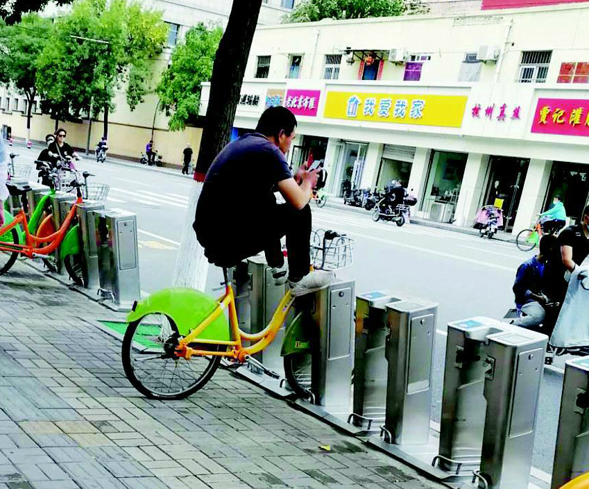 拍攝經(jīng)過:8月20日,我途經(jīng)西華門街一處公共自行車租賃點時,看到一名男子坐在一輛公共自行車上,腳踩著鎖樁,手里還玩著手機。這種行為,既不雅觀,還會損壞鎖樁。在公共場合,請注意自身行為。