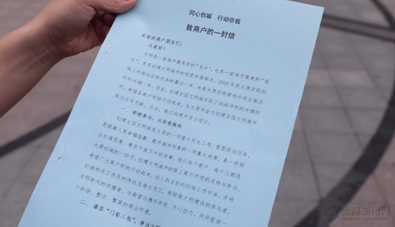 和平時代商業街商管辦主任薛金來表示,商業街每個商戶、每個人都是太原創城的一份子,我們聯合廣大商戶積極行動起來,投入到當前的創城工作中來,積極做文明建設的參與者,文明新風的傳播者,一起攜手并進、齊心協力,共同營造一個和諧、整潔、繁榮的商業環境。